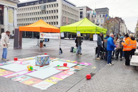 18 octobre dernier, place de la Monnaie, Bruxelles. Une bâche colorée de 16 m² s’étale devant des passants étonnés. Certains ralentissent, d’autres s’arrêtent, intrigués. Nous les
