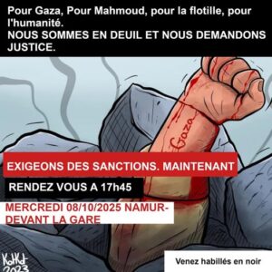 Le lundi 2 octobre 2025, le collec­­­­­­­­­­­tif #Avec toi Gaza a rejoins Action Pales­­­­­­­­­­­tine Namur qui a orga­­­­­­­­­­­nisé un rassem­­­­­­­­­­­ble­­­­­­­­­­­ment d’ur­­­­­­­­­­­gence en réac­­­­­­­­­­­tion à l’in­­­­­­­­­­­ter­­­­­­­­­­­cep­­­­­­­­­­­tion illé­­­­­­­­­­­gale de la Global Sumud Flotilla, une flot­­­­­­­­­­­tille trans­­­­­­­­­­­por­­­­­­­­­­­tant une cargai­­­­­­­­­­­son d’aide huma­­­­­­­­­­­ni­­­­­­­­­­­taire à desti­­­­­­­­­­­na­­­­­­­­­­­tion de Gaza. Cette mission paci­­­­­­­­­­­fique, portée par un équi­­­­­­­­­­­page de béné­­­­­­­­­­­voles inter­­­­­­­­­­­­­­­­­­­­­na­­­­­­­­­­­tio­­­­­­­­­­­naux, avait pour objec­­­­­­­­­­­tif de briser le siège imposé à Gaza et de porter un message d’es­­­­­­­­­­­poir et de soli­­­­­­­­­­­da­­­­­­­­­­­rité au peuple pales­­­­­­­­­­­ti­­­­­­­­­­­nien.