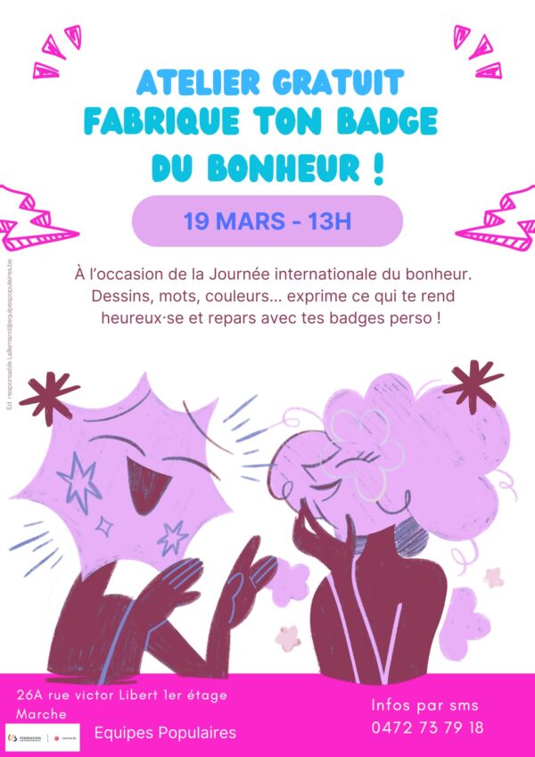 À l’occasion de la Journée internationale du bonheur, nous vous invitons à un atelier gratuit de création de badges personnalisés.
