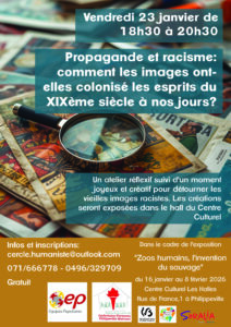 Dans le cadre de l’exposition « Zoos humains », proposée au Centre Culturel de Philippeville du 16 au 30 janvier 2026, nous proposons un atelier de décryptage des images. La propagande s’est toujours appuyée sur les images pour s’immiscer dans les espirts. venez découvrir par quels biais et déjouer les vieilles images racistes par une réappropriation joyeuse et créative!
