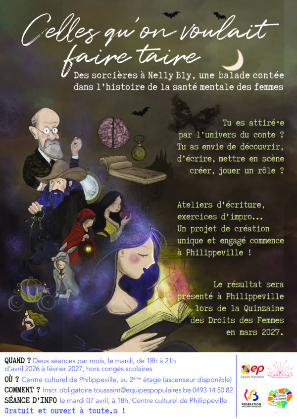 Dans le cadre de la Quin­zaine des droits des femmes 2027, qui abor­dera le thème des femmes et de la santé mentale, nous propo­sons une série d’ate­liers, un mardi sur deux au Centre cultu­rel de Philip­pe­ville.