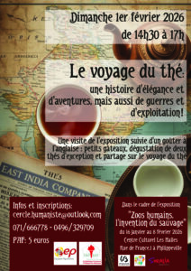Dans le cadre de l’ex­po­si­tion « Zoos humains » propo­sée au Centre Cultu­rel de Philip­pe­ville du 16 au 30 janvier 2026, nous vous propo­sons un après-midi de voyage autour du thé! Après une visite guidée de l’ex­po­si­tion, nous vous offri­rons un goûter à l’an­glaise suivi d’un échange sur le thé.